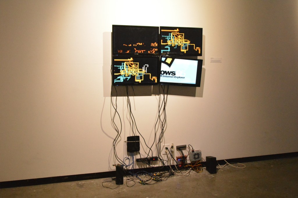 The piece is shown on four screens via parallel computing through a Raspberry Pi cluster (4 pis in total). The cluster consisted of 3 Raspberry Pi 1s with a Raspberry Pi 3 master node used to mount all other Pi nodes onto. Using the mpi4py Python package and omxplayer, the master node executes a Python script that sends and syncs the program to the other three nodes, each executing their respective portion of the code to play a loop of Windows 95 visuals I created using found footage and After Effects.